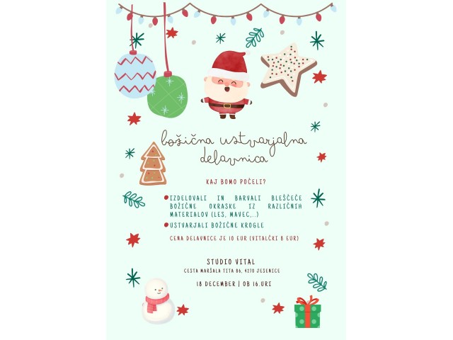 Pridružite se nam na čarobni božični ustvarjalni delavnici, 18. decembra ob 16. uri bomo skupaj ustvarjali čudovite božične okraske za jelko iz različnih materialov, jih barvali in na koncu izdelali še svojo prav posebno snežno kroglo.
